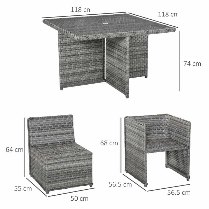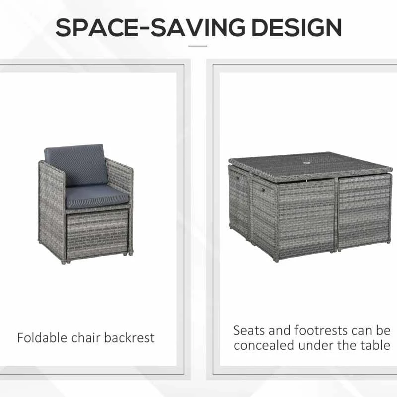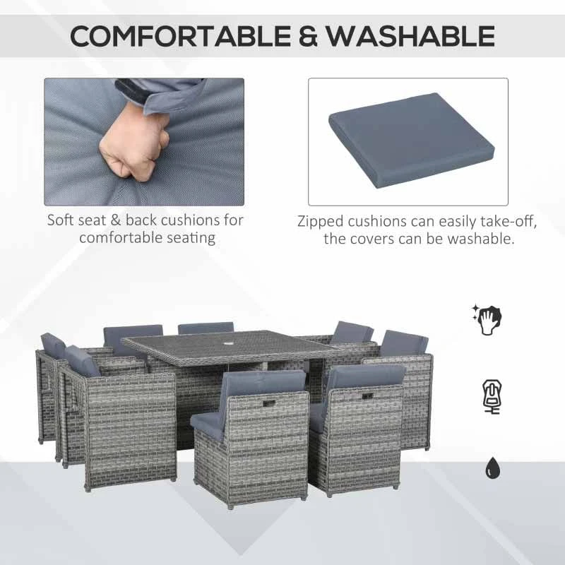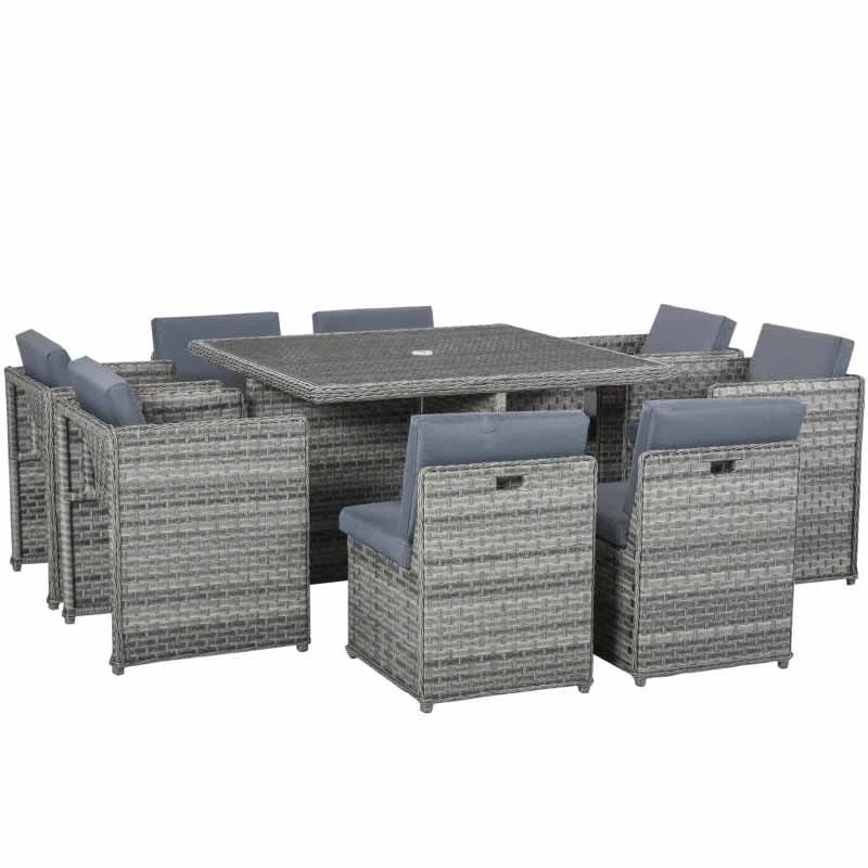 This 9 piece rattan garden dining set from Outsunny will always bring the family together. Ideal for garden and other outdoor areas, It will blend in perfectly anywhere it is placed. The solid frame is made with a rust-resistant metal, PE wicker of the rattan cube dining sets is woven around for extra durability and weather resistance.