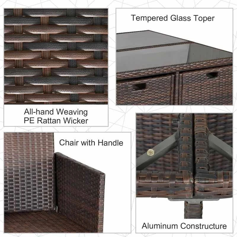 - 9 pieces rattan dining set includes 1 table, 4 chairs and 4 footrests