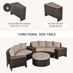 Check out this Outsunny 8-piece rattan garden sofa set with 4 armless chairs, 3 small tables and round ottoman that we can be sure will compliment your outdoor living space perfectly. Constructed from a metal frame and covered in a PE rattan wicker, this garden sofa set is durable, strong and will last for years to come. The extra wide seats, high back and arm rests will keep you and a few friends supported and completely comfortable for hours on end. The thick cushions, each have a zip making them easy to remove to wash and maintain yourself at home. The large foot stool is ideal for you and a few friends to sit back and relax with your feet up or for a few more others to sit around the sofa. With three side tables there is ample of space for you and your friends to rest your drinks or snack bowls, why not keep shaded on warm summer days with the umbrella hole in the middle table that securely holds a parasol. Finished off with an elegant, curved back design this rattan furniture garden set is modern, stylish and will finish off your garden nicely.