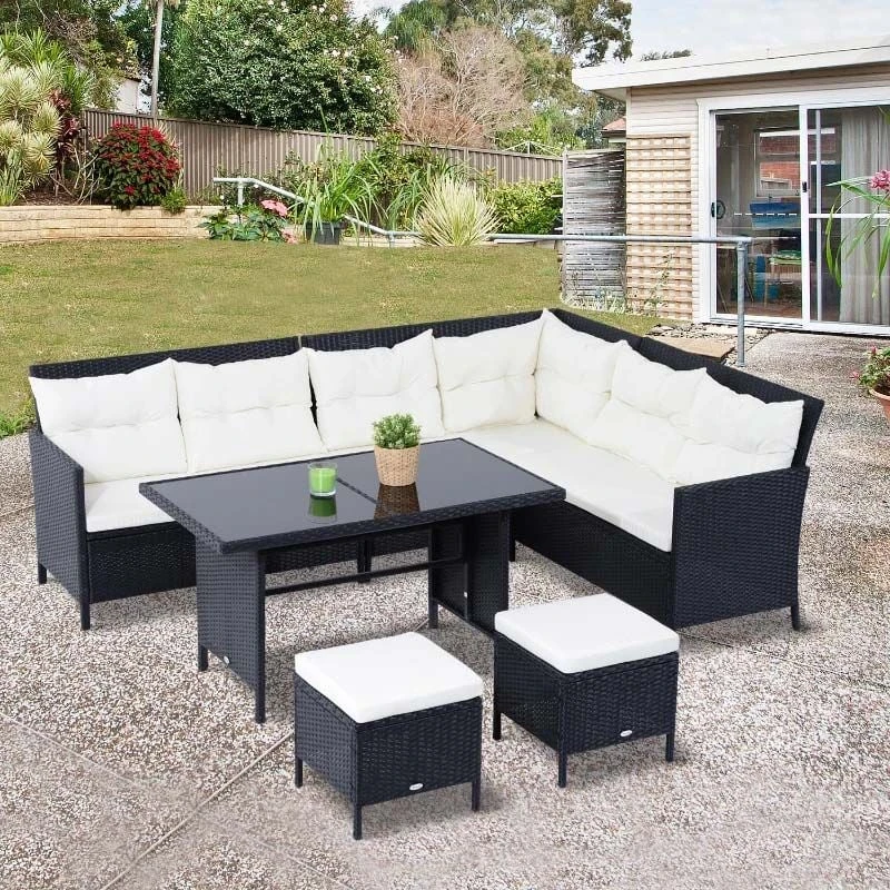 Check out this Outsunny 6-piece rattan garden sofa dining set with 2 sofas, middle chair, 2 foot stools and table that we can be sure will compliment your outdoor living space perfectly. The modern design mean you can tuck the sofa into a nice corner of your garden making the most out of your space. Constructed from a metal frame and covered in a PE rattan wicker, this garden sofa set is durable, strong and will last for years to come. The extra wide seats, high back and arm rests will keep you and a few friends supported and completely comfortable for hours on end. The thick cushions, each have a zip making them easy to remove to wash and maintain yourself at home. The coffee table and ideal for resting your drinks or snack bowls and is lightweight so is easily manoeuvred to your preferred position, even with the glass top finish. Sit back and relax with your feet up with the foot stools or use as additional seating to entertain a few others. If you are looking for a relaxing and modern rattan garden sofa set, this is the one for you.