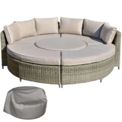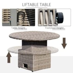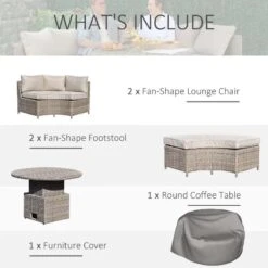 Check out this Outsunny 5-piece rattan garden sofa dining set with 2 fan shaped sofa, 2 foot stools. Coffee table and cover that we can be sure will compliment your outdoor living space perfectly. The modern design mean you can tuck the sofa into a nice corner of your garden making the most out of your space. Constructed from a metal frame and covered in a PE rattan wicker, this garden sofa set is durable, strong and will last for years to come. The extra wide seats, high back and arm rests will keep you and a few friends supported and completely comfortable for hours on end. The thick cushions, each have a zip making them easy to remove to wash and maintain yourself at home. The coffee table and ideal for resting your drinks or snack bowls, the height can be adjusted to your preferred height by simply lifting the top. Sit back and relax with your feet up with the foot stools or use as additional seating to entertain a few others. If you are looking for a relaxing and modern rattan garden sofa set, complete with furniture cover, this is the one for you.