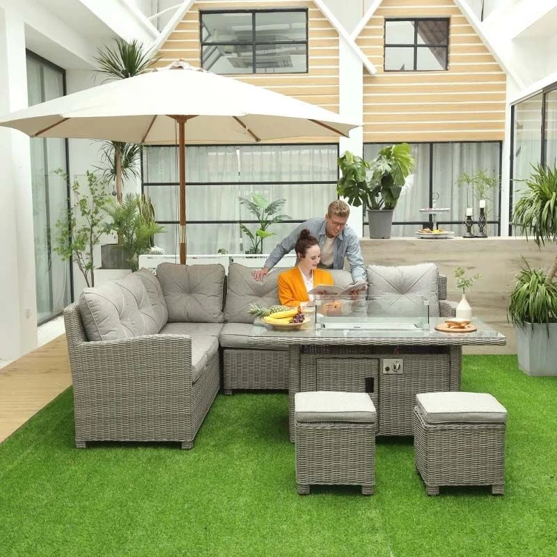- Set includes two 3-seater sofas, two footstools and a gas fire pit table