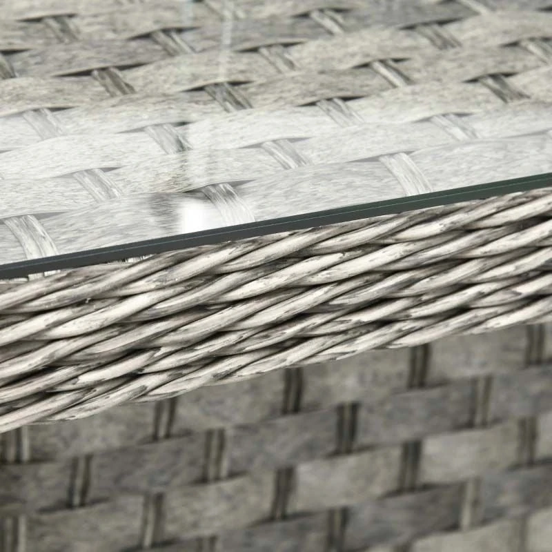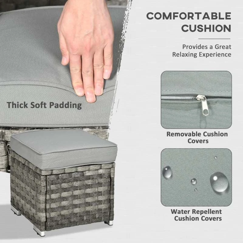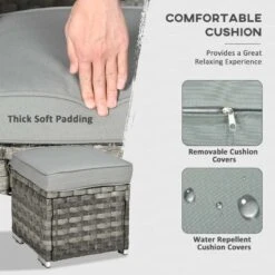 Check out this Outsunny 7-piece rattan garden sofa set with two corner loveseats, standard loveseat, three foot stools and a fire pit table that can be moved into your preferred positions to suit your garden space, we are sure this garden set will compliment your outdoor living space perfectly. Constructed from a metal frame and covered in a PE rattan wicker, this garden table set is durable, strong and will last for years to come. The extra wide seats, high back and arm rests will keep you and a few friends supported and completely comfortable for hours on end. The thick cushions, each have a zip making them easy to remove to wash and maintain yourself at home. Keep warm on cooler evenings with the central table fire pit, the under-table storage for the gas bottle is stylish and discrete. The foot stools are ideal for you and a few friends to sit back and relax with your feet up or for a few more others to sit around the fire pit table. Finished with a tempered glass tabletop that is easily cleaned and back cushions, this rattan garden table set is comfortable and stylish.