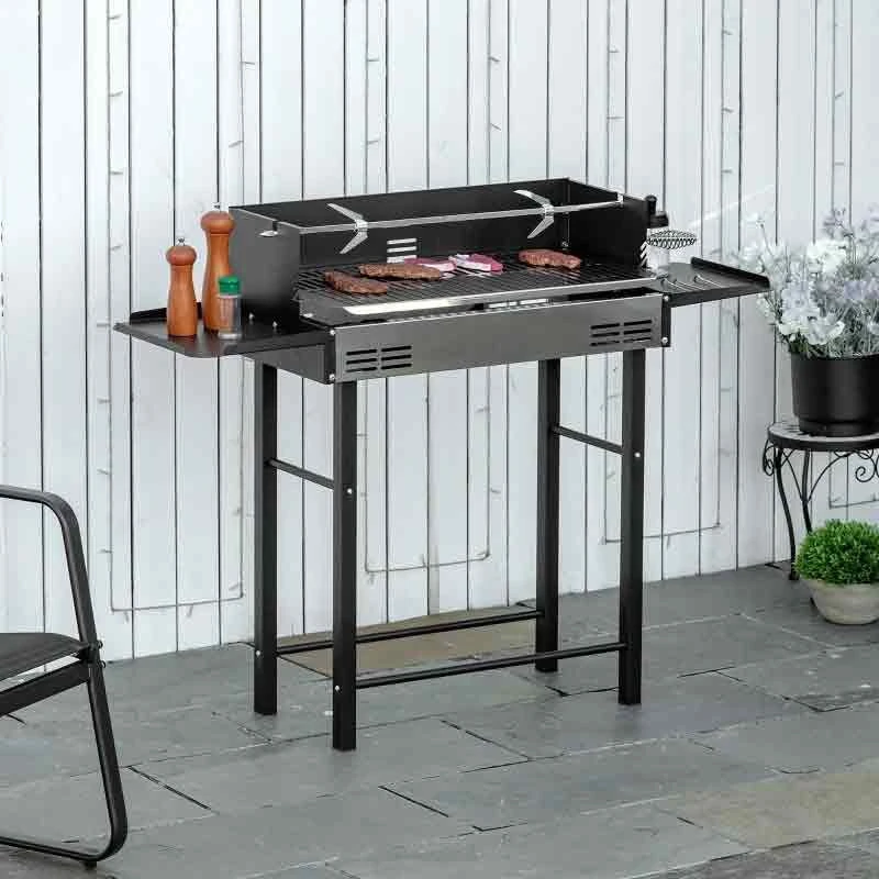 The Outsunny BBQ Rotisserie Grill Roaster is a 2 in 1 rotisserie grill where you can roast a whole chicken or a chunk of meat on the upper rotisserie and barbecue in the grill net cooking area below. The windshield can be detached, and the lower grill part can be used individually, which is also more convenient to be taken out. Adjust the grill rack with the three layers of slots on the windshield to control the heating temperature, meeting different temperature needs for varies of ingredients. The two side seasoning tables free your hands up, so that you can focus on grilling. The folding design saves much storage space. The grill rack and the charcoal basin are made of stainless steel for long term use and easy cleaning and there are also protective foot covers to prevent slipping as well as preventing scratches to the frame and your floor.
