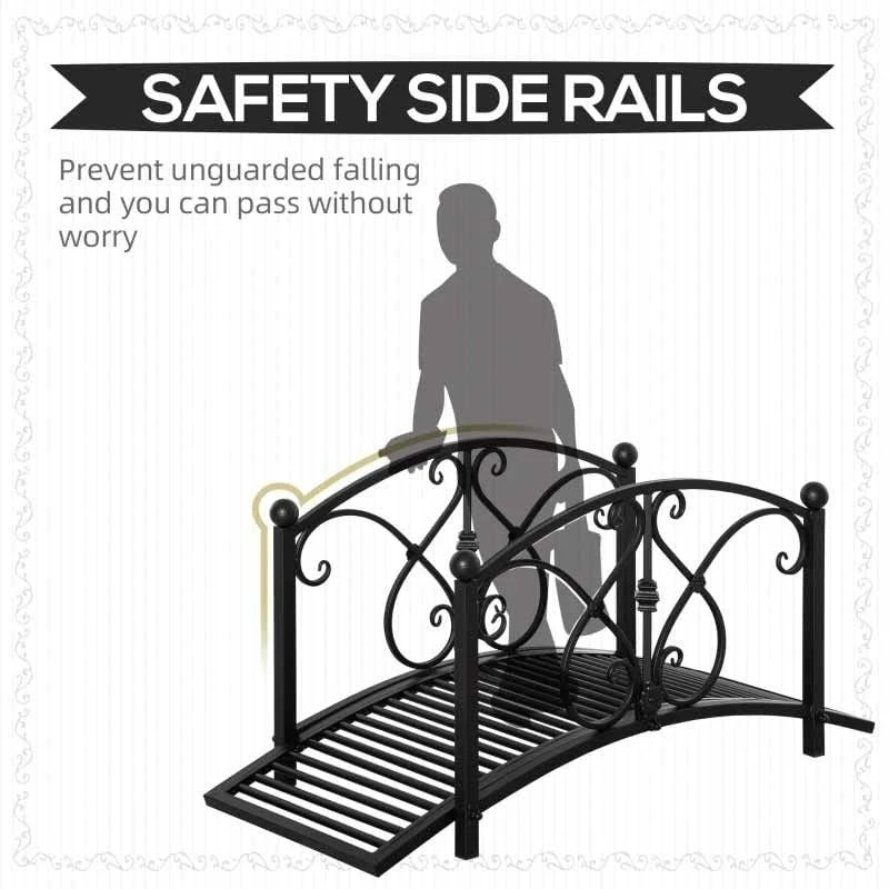 Introduce a touch of vintage charm to your backyard garden, pond, or small stream with the Outsunny Vintage Patio Garden Bridge with Rails. This exquisite landscape decor piece serves as the perfect centerpiece for your landscaping, creating a picturesque and serene atmosphere. The elegant traditional design of the bridge kit invites you to pause, reflect, and immerse yourself in the beauty of nature. Crafted with a curved bridge frame and side rails, this bridge not only adds beauty but also provides stability. The sturdy metal frame undergoes two processes of electrophoresis and powder coating, ensuring durability and resistance to outdoor elements. With its vintage style and floral pattern, this garden ornament effortlessly enhances the look of any garden walkway.
