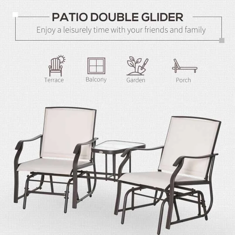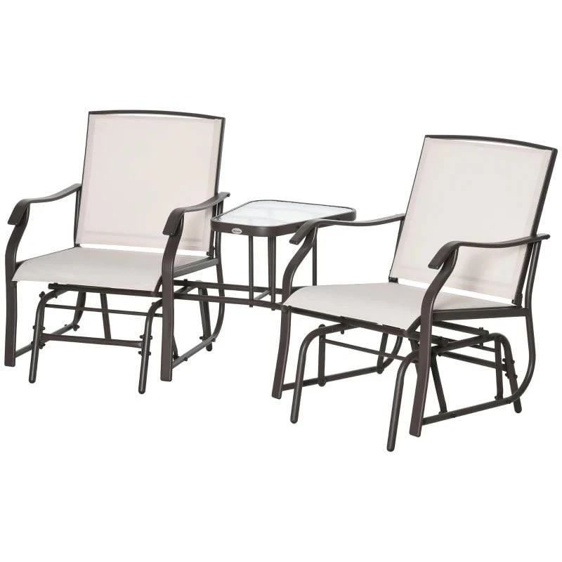 If you are looking for a modern design piece of furniture to complement your outdoor living space, this Outsunny rocking garden chair set is the one for you. Constructed from a strong metal powder coated frame, this garden bench will last for years to come. Covered in a texeline material, it will be protected from the elements by draining water and will circulate air to keep you cool on warm summer days. The gliding arms will gently rock you back and forth keeping you completely relaxed for hours on end. With a deep seat, high back and curved arm rest, this garden chair will keep you supported and comfortable all day long. Complete with a tempered glass central table perfect for you and a friend to rest your drink or book.