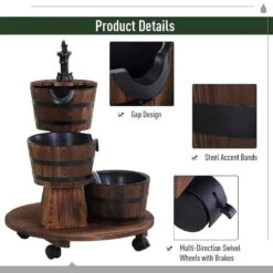 Add a unique touch to your garden with the Outsunny fir wood 3 barrel water fountain. This charming fountain features a three-pot design with a top tap, creating a visually appealing water flow that gently overflows into the pots. Powered by electricity, the pump rotates at 3600r/minute, efficiently bringing the water at the bottom back to the top and preventing any wastage. The solid fir wood body in a rustic finish adds a touch of natural beauty, while the plastic-lined buckets ensure durability and prevent damage and rotting caused by water. The round base is equipped with two locking wheels, allowing for easy movement and secure placement. Vintage steel bands on the barrels add a beautiful finish to this fountain.
