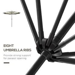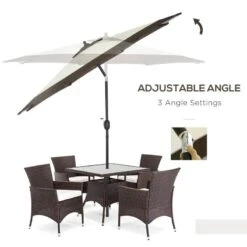 Stay protected from the sun while enjoying the outdoors with the Outsunny Outdoor Patio Umbrella. This versatile sun umbrella allows you to control the angle of shade, eliminating glare and providing a comfortable environment. Designed in two attractive colors, it complements any outdoor setting, from parks and gardens to patios and beaches. The tiltable canopy with three angle settings ensures protection from the setting sun. Crafted with a sturdy metal frame and 180gsm polyester fabric, this garden umbrella is built to last. The vented canopy and eight ribs keep it stable even in windy conditions. With a convenient crank handle, opening and closing the umbrella is easy. Assembly is required, and it comes with a two-section pole for easy transport.