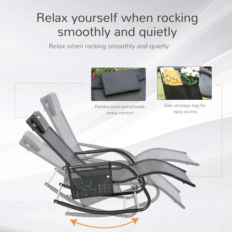 If you are looking for a modern piece of furniture to finish off your outdoor living space, this Outsunny reclining rocker garden chair is the one for you. The added head rest pillow and wave seat design perfectly contours your body keeping you supported and comfortable all day long. Constructed from strong powder coated steel frame, this garden chair is durable, protected from the elements and will last for years to come. Completely covered in a texeline sling fabric it drains water and is easily cleaned with a damp cloth. The bonus added side pocket is handy for keeping your sunglasses, phone or book safe and accessible.