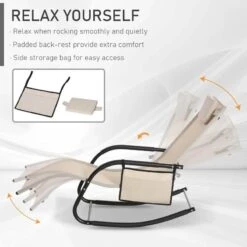 If you are looking for a modern piece of furniture to finish off your outdoor living space, this Outsunny reclining rocker garden chair is the one for you. The added head rest pillow and wave seat design perfectly contours your body keeping you supported and comfortable all day long. Constructed from strong powder coated steel frame, this garden chair is durable, protected from the elements and will last for years to come. Completely covered in a texeline sling fabric it drains water and is easily cleaned with a damp cloth. The bonus added side pocket is handy for keeping your sunglasses, phone or book safe and accessible.