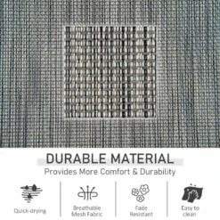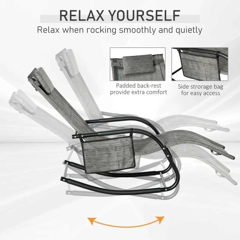 If you are looking for a modern piece of furniture to finish off your outdoor living space, this Outsunny reclining rocker garden chair is the one for you. The added head rest pillow and wave seat design perfectly contours your body keeping you supported and comfortable all day long. Constructed from strong powder coated steel frame, this garden chair is durable, protected from the elements and will last for years to come. Completely covered in a texeline sling fabric it drains water and is easily cleaned with a damp cloth. The bonus added side pocket is handy for keeping your sunglasses, phone or book safe and accessible.
