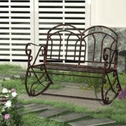This Outsunny two-seater rocking chair is an elegant and classic piece of furniture to finish of your outdoor living space. Made from metal, this rocking chair has a red bronze finish which will compliment your garden nicely. The rocking frame will smoothly glide you back and forth for ultimate relaxation. Featuring a deep seat, high back and curved armrests this garden bench is supporting and comfortable.