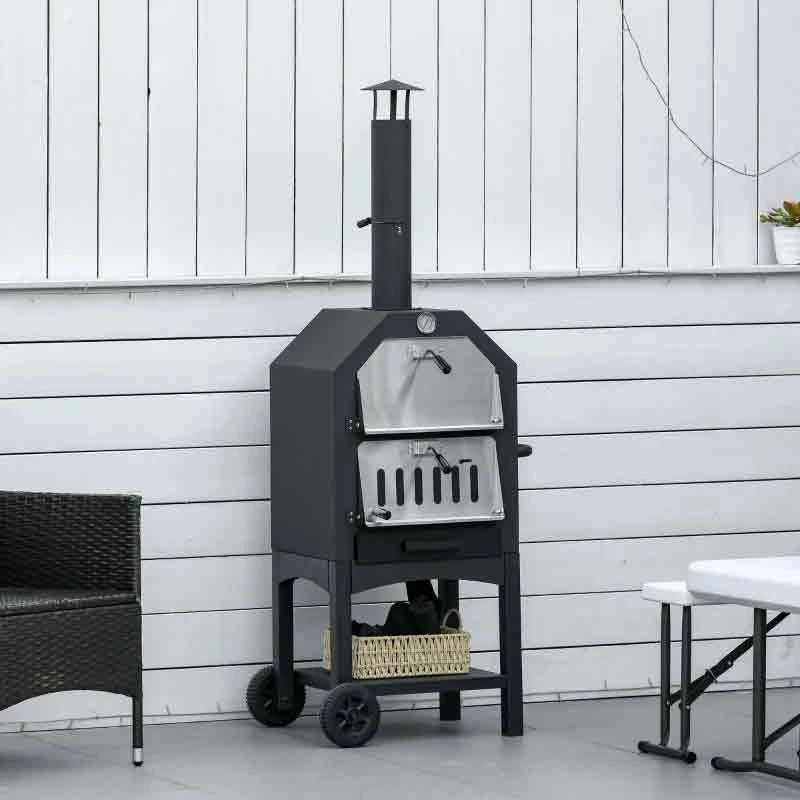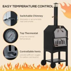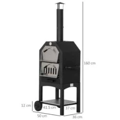 The Outsunny Outdoor Pizza Oven Charcoal BBQ Grill has a charcoal shelf, a bottom shelf for ash catcher, with handles on the doors for easy opening and closing. There is also a bottom shelf for easy and convenient storage. This BBQ has a tough shell, and is heat resistant, rusting and scratch damage which is perfect for repeated use outdoors. The on-unit thermometer keeps you aware of the temperature inside, preventing you from burning the pizzas whilst they cook. The long chimney extracts smoke and safely lets it bellow out from the top – ensuring a smoke-free environment every time and the two wheels allows you to move the unit around easily – perfect for storing away when not needed and bringing out with no hassle.