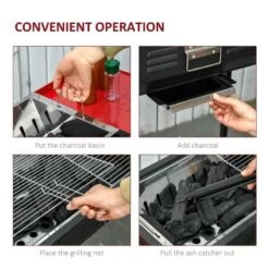 The Outsunny Portable Charcoal Grill BBQ comes with a large grilling area with two grill nets and one grill pan to cook different flavors of food. There are also two side shelves for temporarily storing seasonings, plates, utensils, etc. The grill height is also adjustable so you can customize it for the person in charge of the BBQ. The legs are easy to detach and install by the included screws and the foldable shelves, detachable legs, and side handles allow it to be taken away with you during picnics, camping trips, festivals, allowing you to cook delicious BBQ food wherever you go. The freestanding barbecue is made from a powder-coated metal frame and enamel gill pan, which is designed to last for years. Equipped with a charcoal basin, this has been designed to elevate the fuel away from the bottom to prolong the service life of the product.