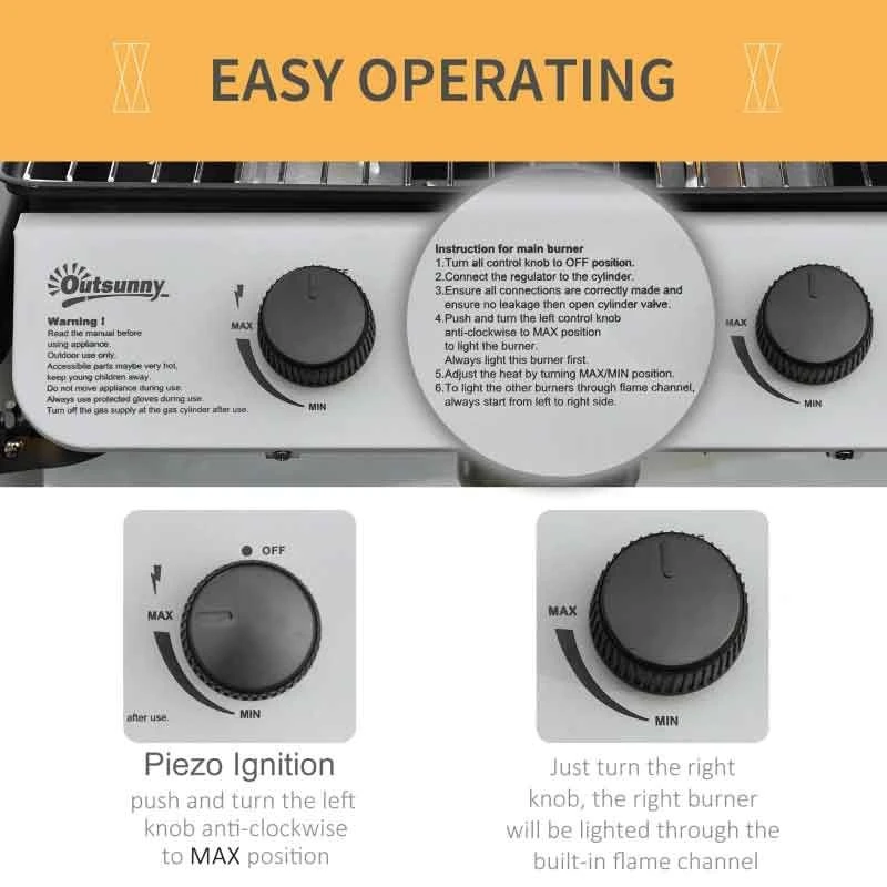 The Outsunny Propane Gas BBQ Grill features two 2.8KW burners and ABS knobs for lighting and adjusting the fire. The large grill net provides enough cooking area for meat, vegetables, and seafood. The left burner is equipped with piezo ignition by pushing and turning the left knob anti-clockwise to MAX position, and then just turn the right knob, the right burner will be lighted through the built-in flame channel. The galvanized grease catch pan for easy cleaning of the oil (NOTE: It’s supposed to be covered with sand that can absorb grease. Please clean the grease catcher after use). The extended side racks provide extra space for grilling essentials and accessorie as well.