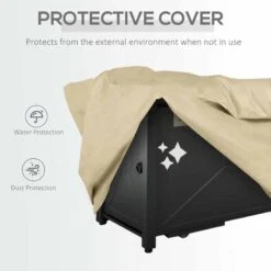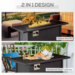 This Outsunny Gas Fire Pit is a stylish addition to your outdoor areas. Two-in-One design serves both as a firepit and a table with a lid that can cover the firepit. The 50000 BTU stainless steel burner provides clean and smokeless burn, helping to retain the warmth longer. The pulse ignition system starts and adjusts the flame easily (1 x AAA battery required). This tabletop fire pit uses a standard propane tank that easily installs into the base of the fire table. The outdoor fire pit features a door in the base to store a propane tank and keep it out of sight. Made from metal for durability and a sleek look. Fabric with PVC coating protects the firepit when not being used.