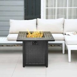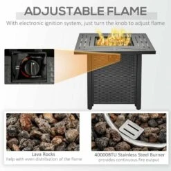 This Outsunny Gas Fire Pit is a stylish addition to your outdoor areas. Two-in-One design serves both as a firepit and a table with a lid that can cover the firepit. The 40000 BTU stainless steel burner provides clean and smokeless burn, helping to retain the warmth longer. The electronic ignition system starts and adjusts the flame easily. This tabletop fire pit uses a standard propane tank that easily installs into the base of the fire table. The fire pit features a door in the base to store a propane tank and keep it out of sight. Made from metal for durability and strength. Comes with a waterproof cover made of Oxford cloth with PVC liner coating providing protection when not in use