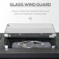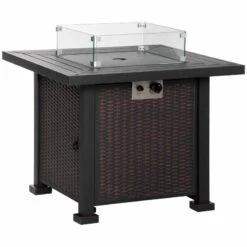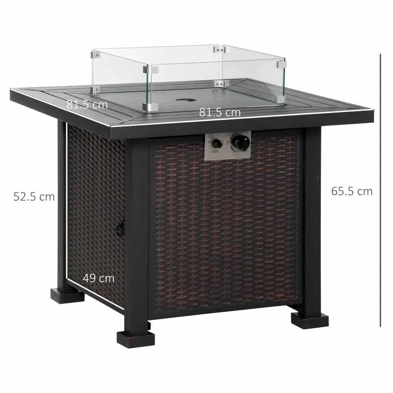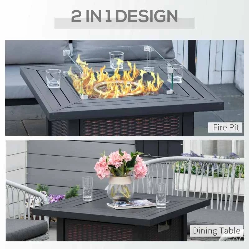 This Outsunny Gas Fire Pit is a stylish addition to your outdoor areas. Two-in-One design serves both as a firepit and a table with a lid that can cover the firepit. The 50000 BTU stainless steel burner provides continuous warmth and the pulse ignition system starts and adjusts flame easily (AAA Battery required). This tabletop fire pit uses a standard propane tank intake that easily installs into the base of the garden fire table. The outdoor fire pit features a door in the base to store a propane tank and keep it out of sight. Glass screen protects the flame from wind to keep the warmth intact. Transparent glass beads look eye-catching when the flames are on. Made from metal construction which simulates rattan stripes pattern.