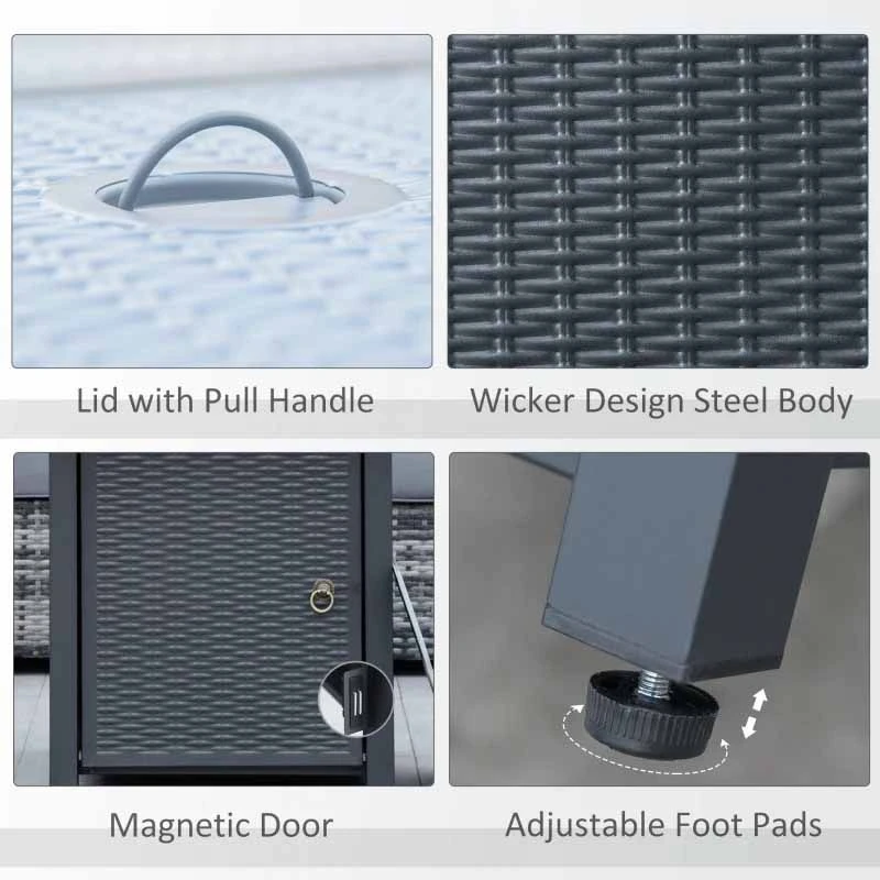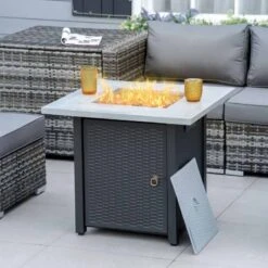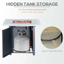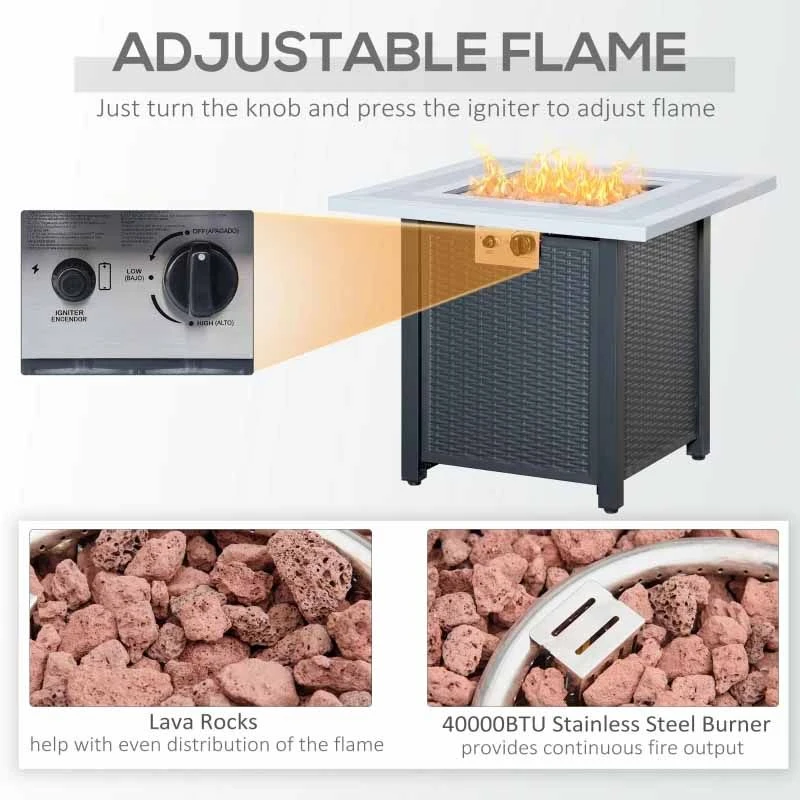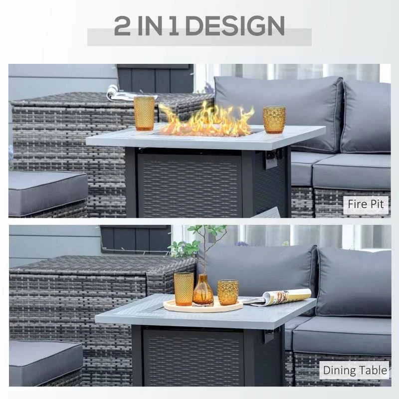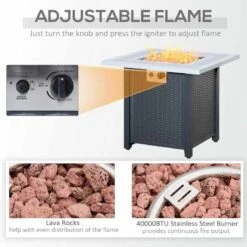 This Outsunny Gas Fire Pit is a stylish addition to your outdoor areas. Two-in-One design serves both as a firepit and a table with a lid that can cover the firepit. The 40000 BTU stainless steel burner provides clean and smokeless burn, helping to retain the warmth longer. The pulse ignition system starts and adjusts the flame easily (1 x AAA battery required). This tabletop fire pit uses a standard propane tank that easily installs into the base of the fire table. The fire pit features a door in the base to store a propane tank and keep it out of sight. Made from metal for durability and strength.