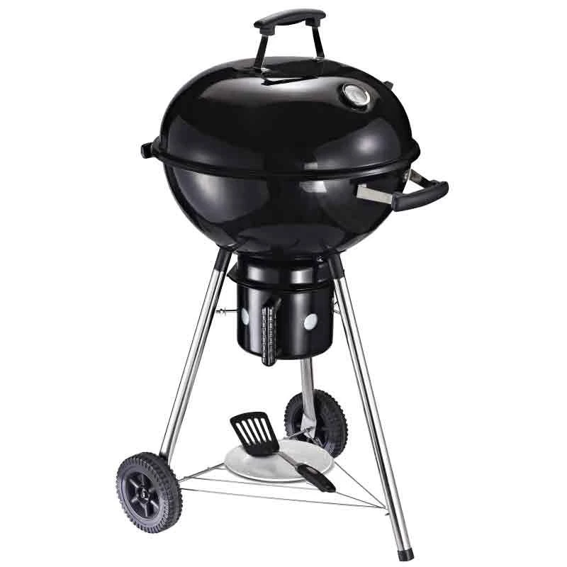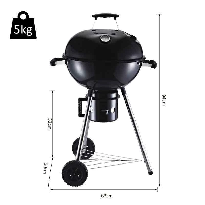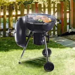 The Outsunny Steel Freestanding Charcoal BBQ Grill With Two Wheels has a classic shape and is a fantastic addition to your BBQs and outdoor parties – a design which will impress your guests just as much as the food it cooks. The portable smoker is tough and sturdy, with an enamel top coating to protect the body against 600℃ – cooking your food quickly and evenly. The heat protective handle keeps cool to prevent you from burns and scalds. With an on body thermometer which is easy to read, the BBQ grill keeps you aware of the temperature when the lid is down, with an adjustable damper to control the air flow, cooking your food exactly how you want it. The chrome cooking grate has widely spaced bars, so the heat can reach the underside of the food better, and the large surface area cooks plenty of food. The bottom charcoal holder utilises the charcoal when cooking so it is burnt fully, collecting all ash together for easy cleaning. There is also a mesh layer to protect your food from the flames. The three legs ensures the charcoal BBQ is kept steady and stable on the ground, with two wheels to move around easily. There is also a small bottom shelf for storage.