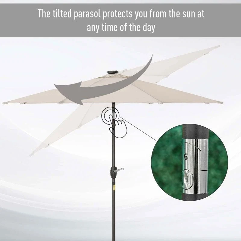 Create a shaded oasis with the Outsunny Outdoor Parasol. This versatile deck parasol is perfect for your patio or garden, providing shade on sunny days and protecting you from rain and wind. The ability to tilt the patio parasol ensures optimal coverage and protection. The steel structure and polyester fabric offer durability and long-lasting performance. Plus, the added feature of solar-powered LED lights with adjustable colors allows you to enjoy the outdoors even after dark. With its lightweight design and easy tilt operation, this garden parasol is a great addition to any outdoor area. Please note that assembly is required, and the umbrella base is not included.