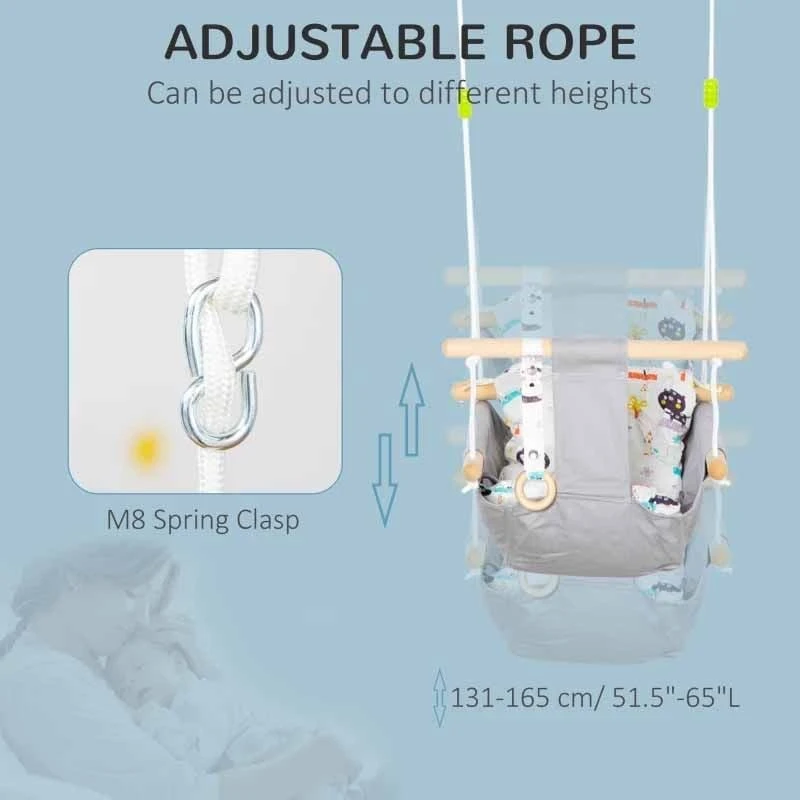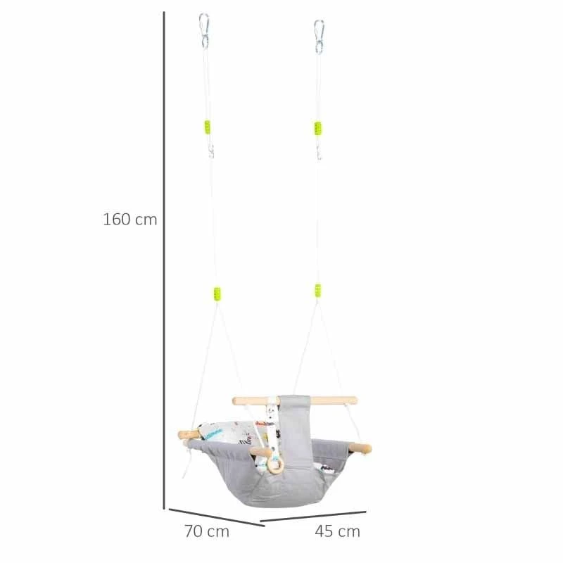 This Outsunny Baby Hammock Swing is a great way to make your baby relaxed, happy, and engaged. The 100% cotton cushion on the seat ensures complete comfort whilst the cotton canvas is soft on their skin. The strong wooden structure provides stability, supporting their weight, whereas the seatbelt keeps them secure. An adjustable hanging rope to set to a level best for you when pushing them forward.