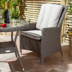 Bring a relaxing dining space into your garden with the addition of the Rowlinson Prestbury Bistro Set, creating a traditional feature with the waterproof rattan material enhancing the design of your patio. This Prestbury Bistro set is ideal for more intimate dining for two or for smaller spaces. It comes complete with the back and seat cushions, two chairs and a glass topped table for resting your drinks, food or book on whilst you enjoy the weather.