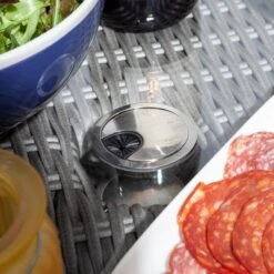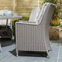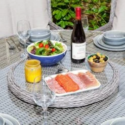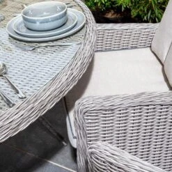 The Rowlinson Prestbury Range is a contemporary collection of rattan furniture that will make al fresco living a joy. Featuring a glass top table, Charcoal Grey cushions with white piping that contrasts perfectly with the natural stone rattan weave, set on a durable powder coated aluminium frame. The Prestbury Six Seater Dining Set is made up of a large 1.5m diameter round dining table with lazy Susan, six armchairs, seat pads and backrest cushions. Covered in a 7mm half round weatherproof weave, the aluminium framework has been powder coated to protect the set from rust.