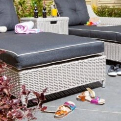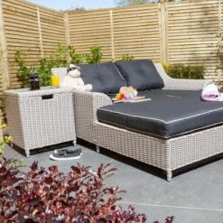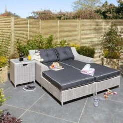 - Includes: 2 Lounger Beds, Cushions & Storage Table
